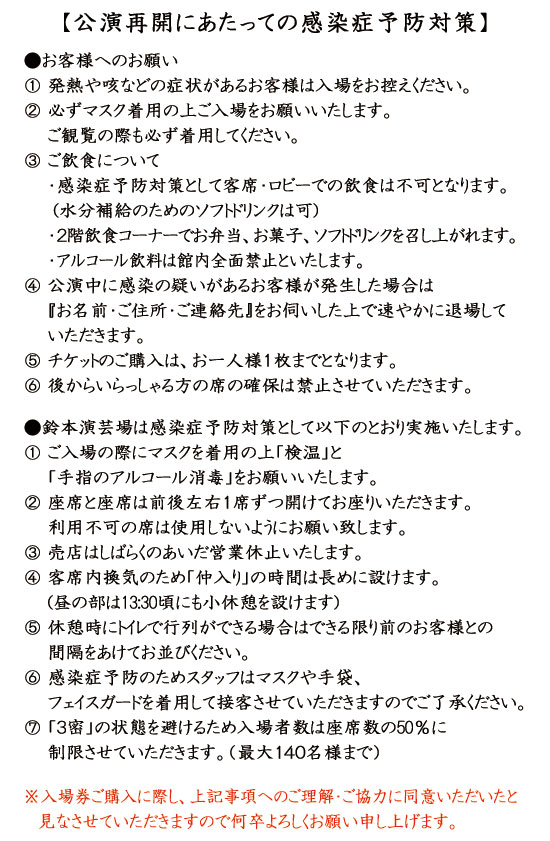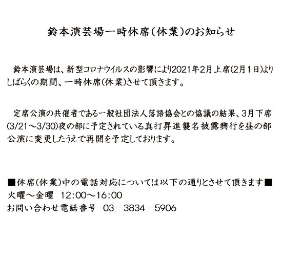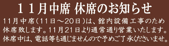◎11月中席(11-20日)は、館内設備工事のため休席いたします。11月21日より通常通り営業いたします。休席中は、電話等も通じませんので予めご了承ください。
